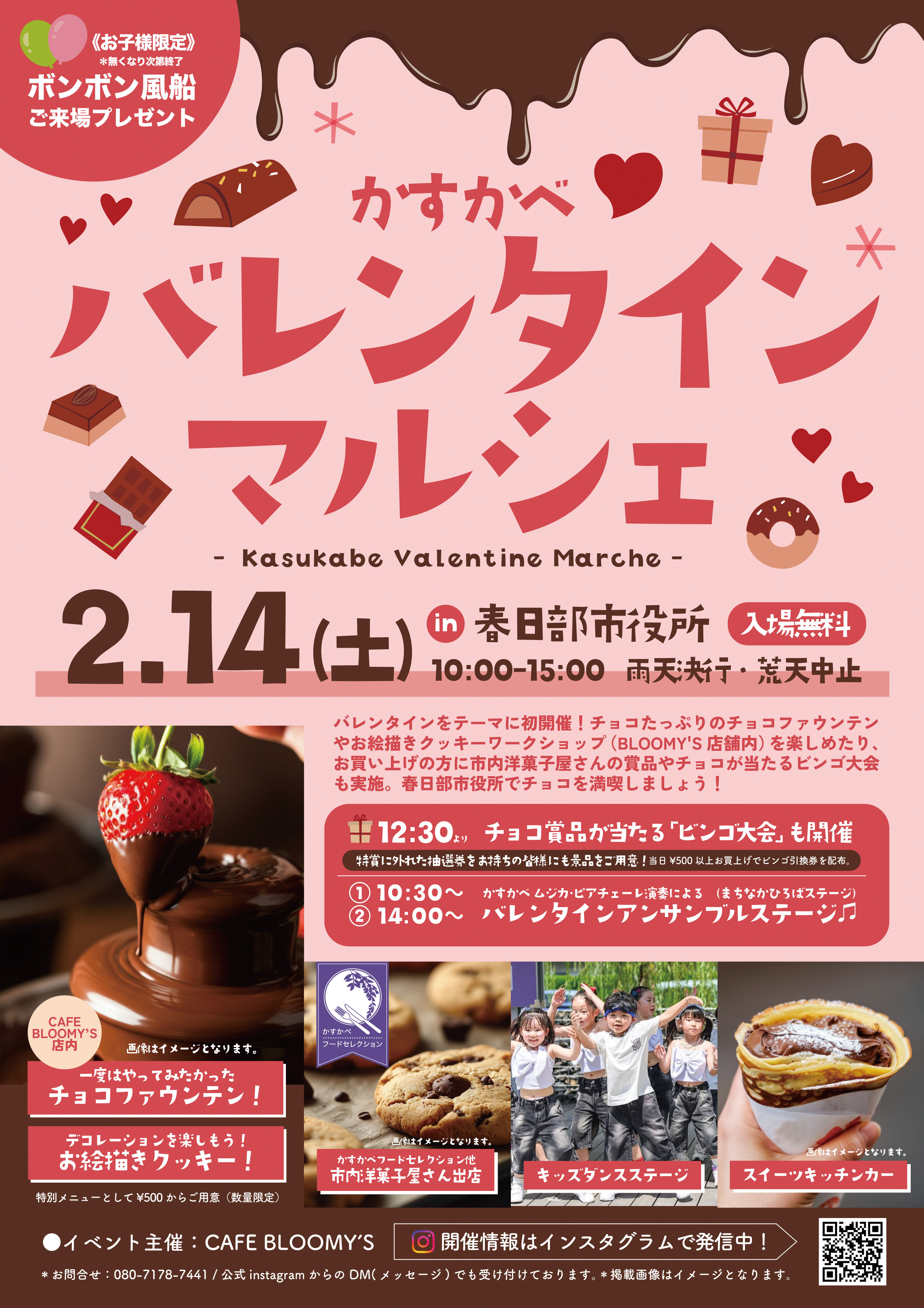 バレンタインをテーマに初開催!チョコたっぷりのチョコファウンテンやお絵描きクッキーワークショップ(BLOOMY'S 店舗内)を楽しめたり、お買い上げの方に市内洋菓子屋さんの賞品やチョコが当たるビンゴ大会も実施。春日部市役所でチョコを満喫しましょう!