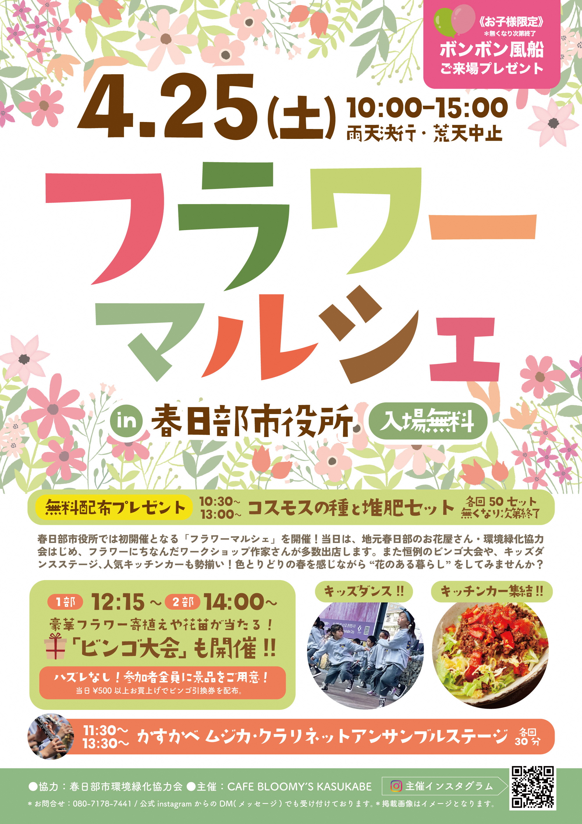 春日部市役所では初開催となる「フラワーマルシェ」を開催!当日は、地元春日部のお花屋さん・環境緑化協力会はじめ、フラワーにちなんだワークショップ作家さんが多数出店します。また、恒例のビンゴ大会や、キッズダンスステージ、人気キッチンカーも勢揃い!色とりどりの春を感じながら”花のある暮らし”をしてみませんか?
